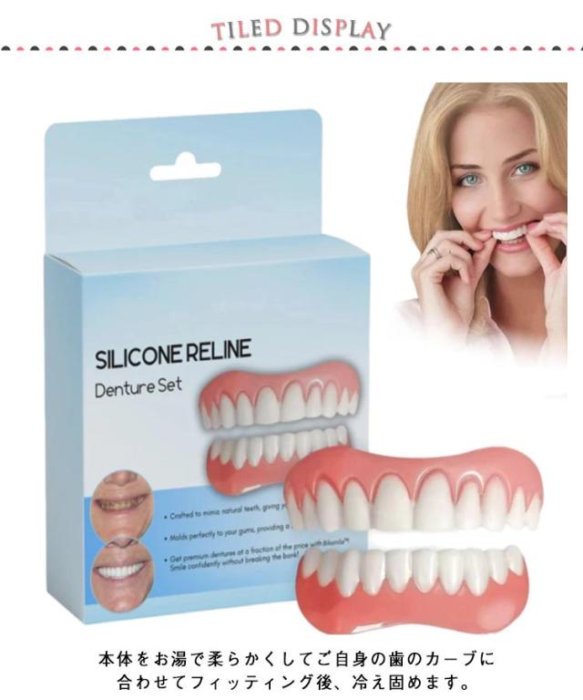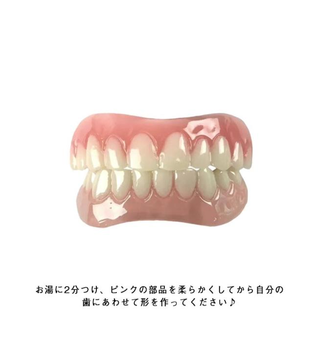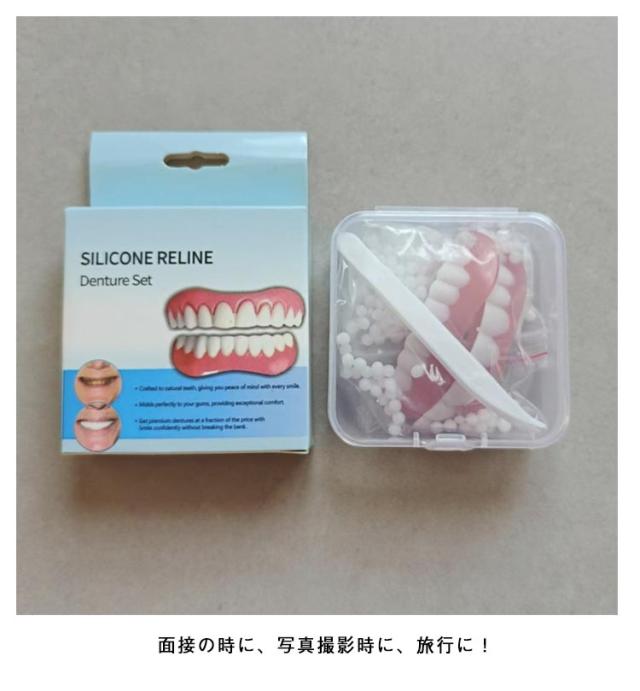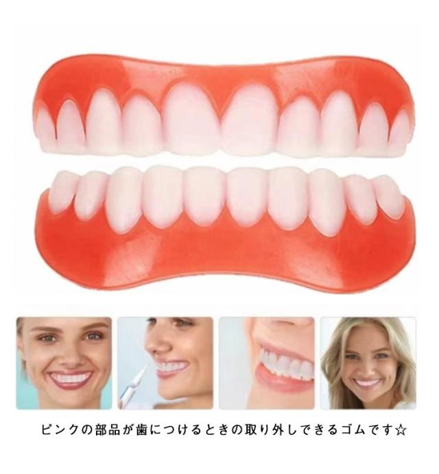 | 2組!上歯+下歯セット 脱着はワンタッチで行えますのでいつでもどこでも気軽に使用出来ます。 本体をお湯で柔らかくしてご自身の歯のカーブに合わせてフィッティング後、冷え固めます。 面接の時に、写真撮影時に、旅行に! お湯に2分つけ、ピンクの部品を柔らかくしてから自分の歯にあわせて形を作ってください♪ ピンクの部品が歯につけるときの取り外しできるゴムです☆ 薄く入れ歯の内側につけ歯に付けます。 そのゴムが自分の歯の隙間などに入り固定できます☆ うまくつかない場合は、市販されている歯接着剤をお使い下さい。 | |