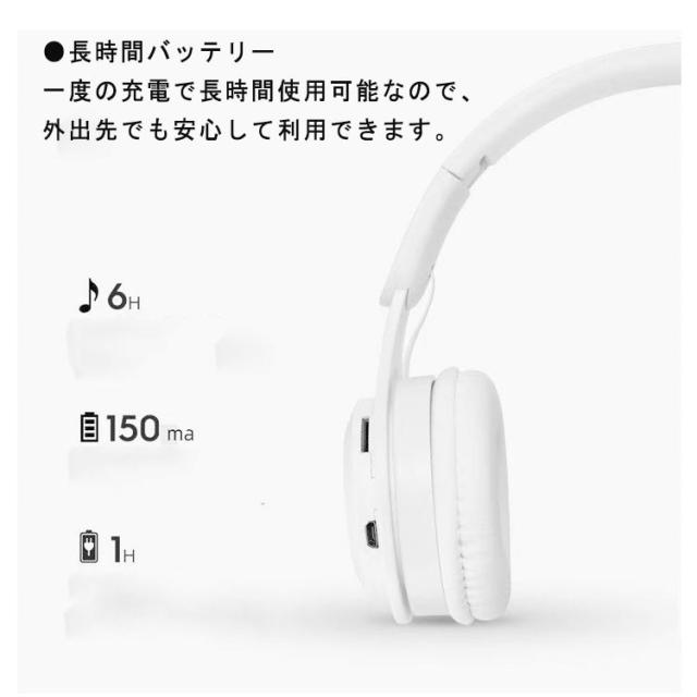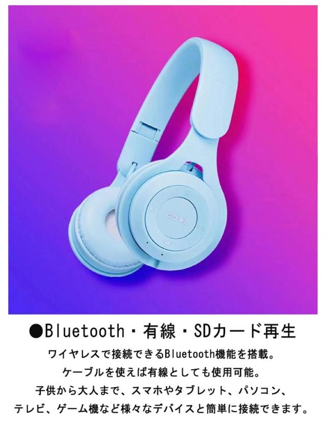 | ●Bluetooth・有線・SDカード再生 ワイヤレスで接続できるBluetooth機能を搭載。ケーブルを使えば有線としても使用可能。子供から大人まで、スマホやタブレット、パソコン、テレビ、ゲーム機など様々なデバイスと簡単に接続できます。 ●密閉型デザイン 外部の音をしっかりと遮断し、高音質な音楽やゲームサウンドを楽しめます。映画やテレビ視聴にも最適です。 ●可愛いデザイン 子供が喜ぶ可愛いデザインで、カラフルなカラーリングやおしゃれな形状が特徴です。持ち運びにも便利な折りたたみ式で、どこへでも持って行けます。 ●軽量で長時間使用可能 軽量設計で、長時間の使用でも疲れにくいです。学校や旅行、家庭での使用に最適です。 ●高音質 迫力あるサウンドを楽しめる40mmの大口径ドライバを搭載しています。音楽やゲームの音質を損なうことなく楽しめます。 ●コンパクトで持ち運び便利 折りたたみ式なので、使わない時はコンパクトに収納できます。バッグに入れて持ち運びも簡単です。 ●長時間バッテリー 一度の充電で長時間使用可能なので、外出先でも安心して利用できます。 | |