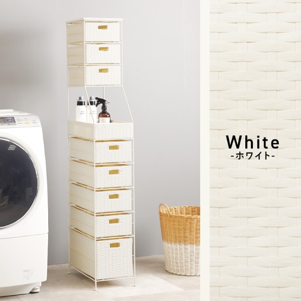 隙間におけるスリムなラタン調収納ラック。ハイタイプで引出しが多く、使用頻度によって使い分けができます。 ■カラー:ホワイト ■サイズ:(約)幅25×奥行45×高さ154cm ■素材:フレーム:スチール、引出:ポリエチレン ■生産地:ベトナム製 ■備考 アジャスター付 お客様組立品 ※お客様組立て品につきましては、組み立て後に不良の連絡をされても対応ができません。組み立て前にパーツに不良・傷等がないか、必ずご確認下さいますようよろしくお願い申し上げます。 ※記載は商品仕様の一部です。仕様説明不足等の理由での返品はできません。特に適合等は必ずご確認ください。