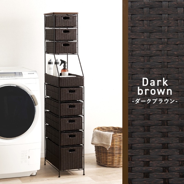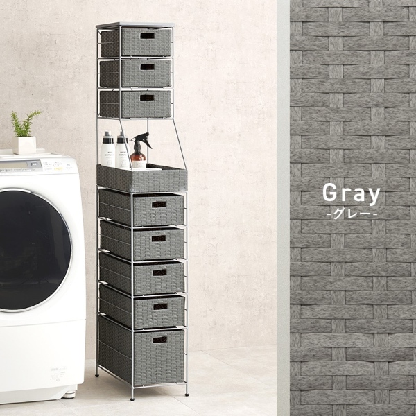 隙間におけるスリムなラタン調収納ラック。ハイタイプで引出しが多く、使用頻度によって使い分けができます。