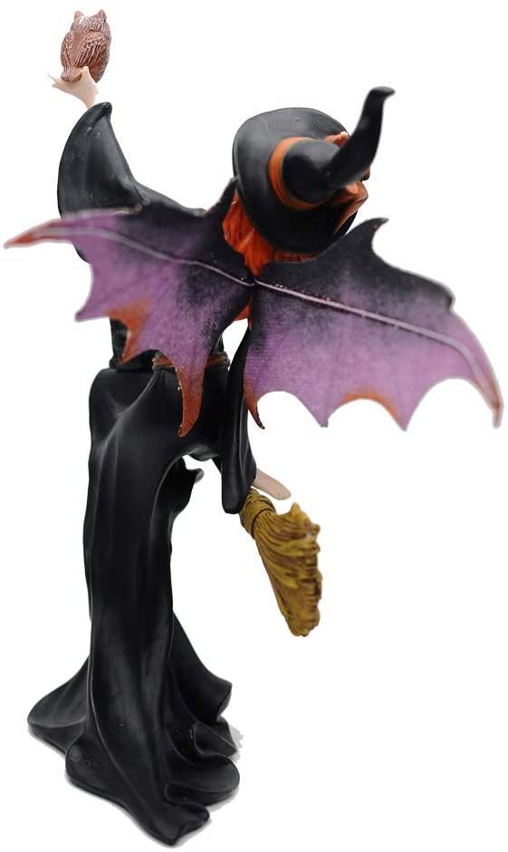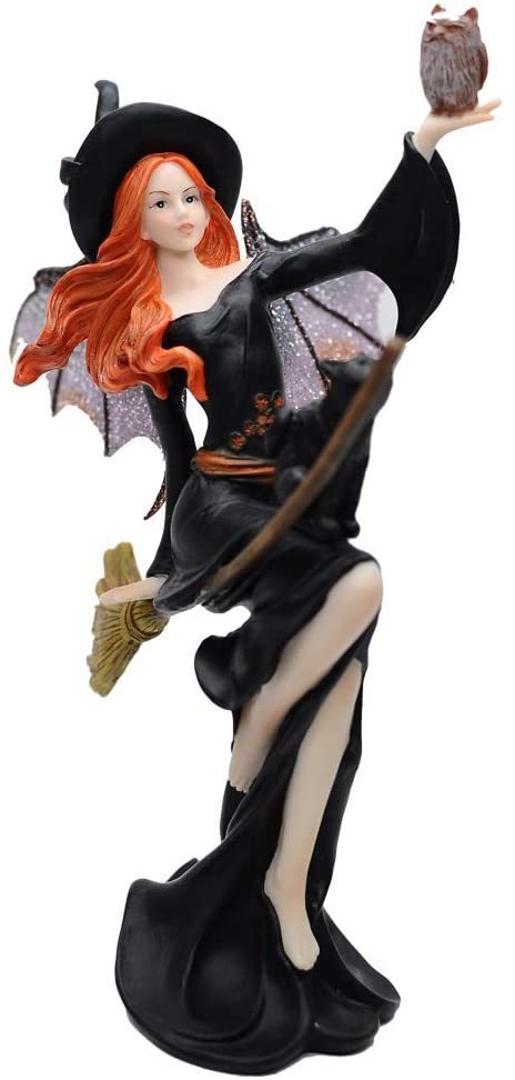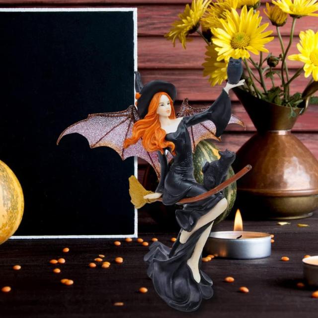 【箒(ホウキ)に乗った、ダーク・フェアリー魔女と黒い猫 置物彫刻、ハロウィーンのテーマギフト高さ 約23cm彫像(輸入品)】