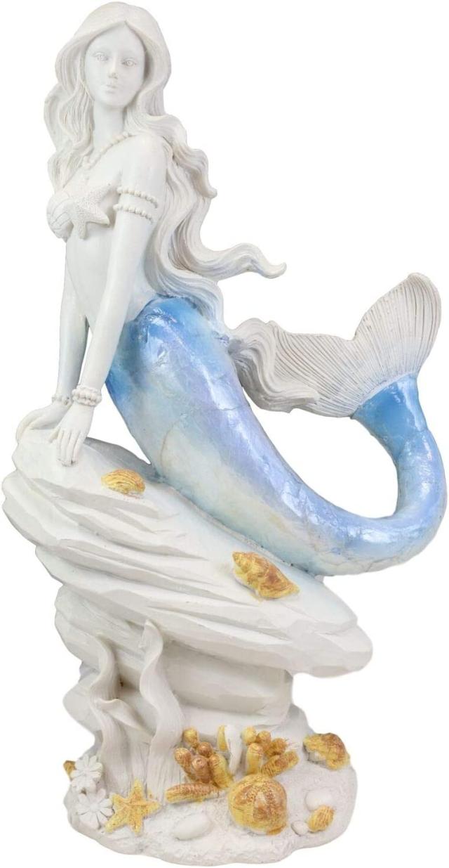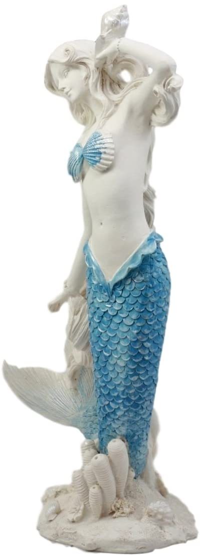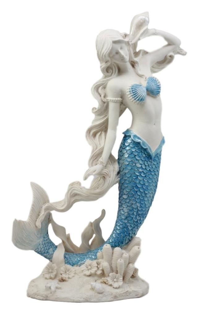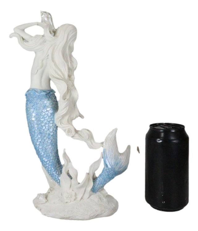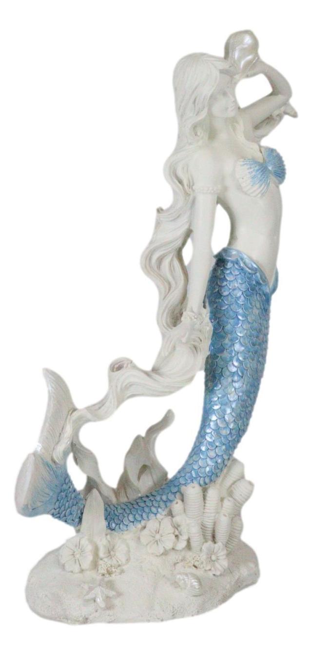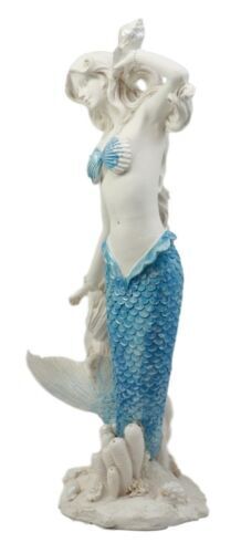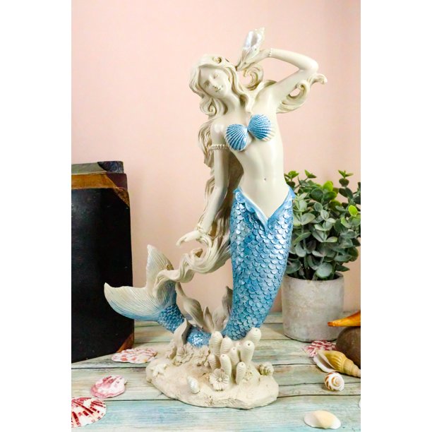 【Aqua Blue Tailed Mermaid Listening to Sconce Figurine 12" H Ocean Goddess Figure - Favorite Decor Store】