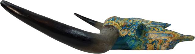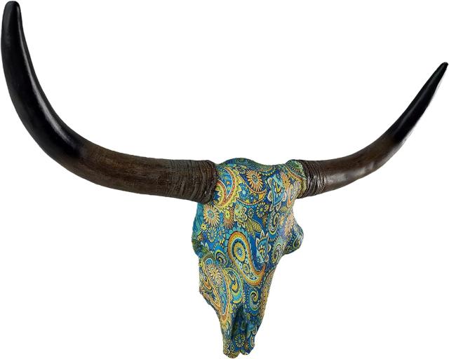 【デレオン製 ペイズリー柄の、ロングホーン・スカル ウォールマウント・カウ・ヘッド 雄牛の頭骸骨 牛角装飾 アート彫刻 彫像 装飾オブジェ(輸入品)】