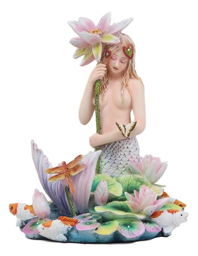 【Ebros Sheila Wolk Rainbow Pool Mermaid by Flower Umbrella Dragonfly and Koi Fishes in Pond Statue 6.25" Tall Mythical Fantasy Siren Mermaids Sea Life Coastal Nautical Decor Figurine】
