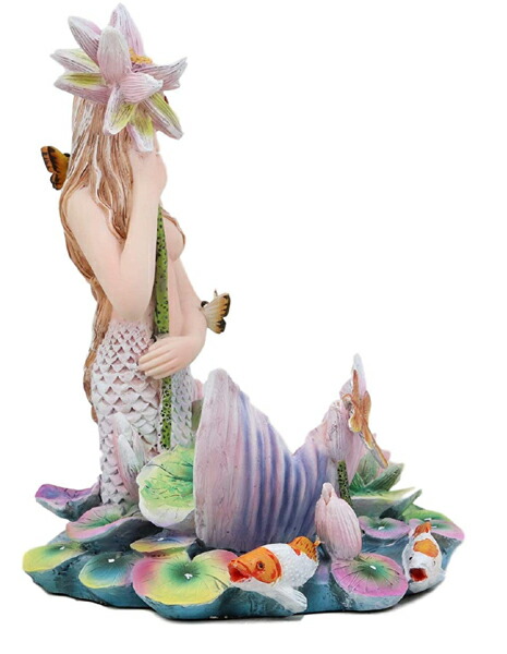 【虹色の池のほとりで、花の傘を持って、トンボや鯉と戯れる、マーメイド(人魚)彫像 海のセイレーン(妖精)彫刻置物/ アリエル リトルマーメイド ポセイドン 水族館 ビーチカフェ プレゼント(輸入品)】