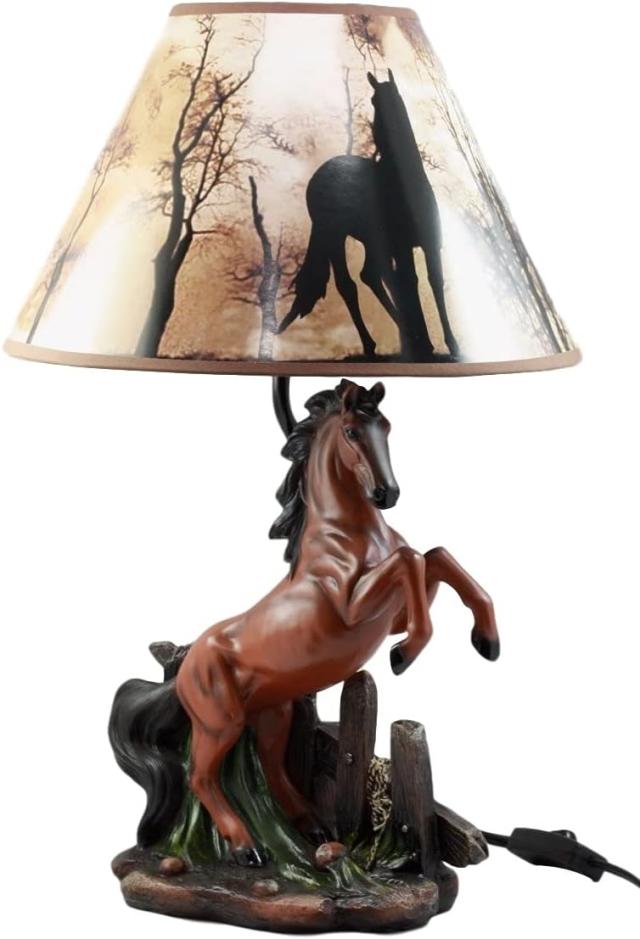 馬が印刷されたシェードを付けた、栗毛野生馬(種馬)彫像 デスクトップ・ランプ ホーム装飾品 素朴なカントリー(輸入品)
