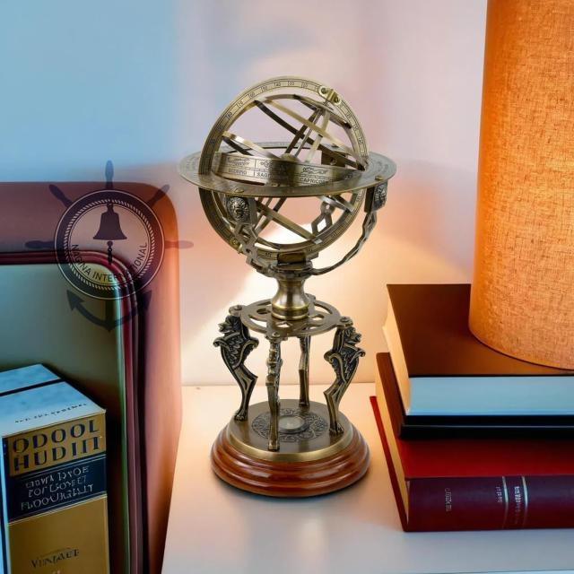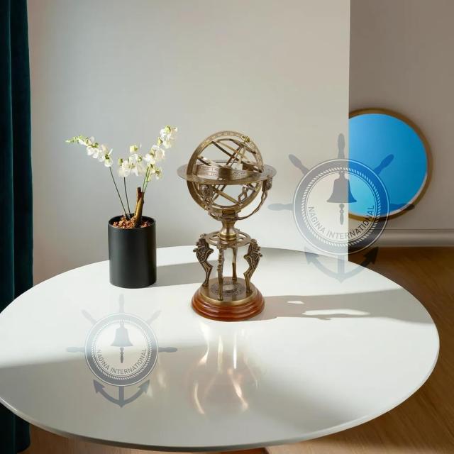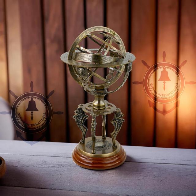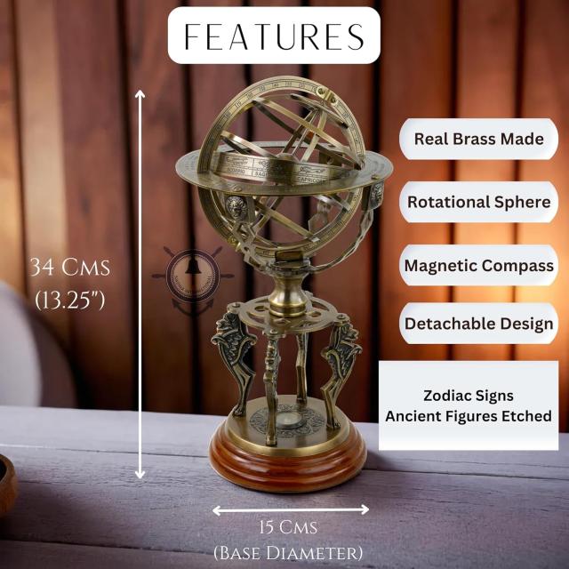 Antique Finish Solid Brass Zodiac Globe Sphere Armillary With Compass And Wooden Base | Home Decor & Table Top Desk Displaypiece Accent With Zodiac Signs Small (13 Inches)
