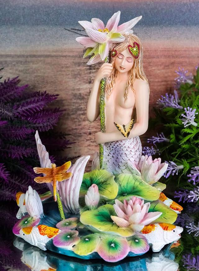 【虹色の池のほとりで花の傘を持ってトンボや鯉と戯れるマーメイド(人魚)彫像海のセイレーン(妖精)彫刻置物/ プレゼント 贈り物(輸入品)】
