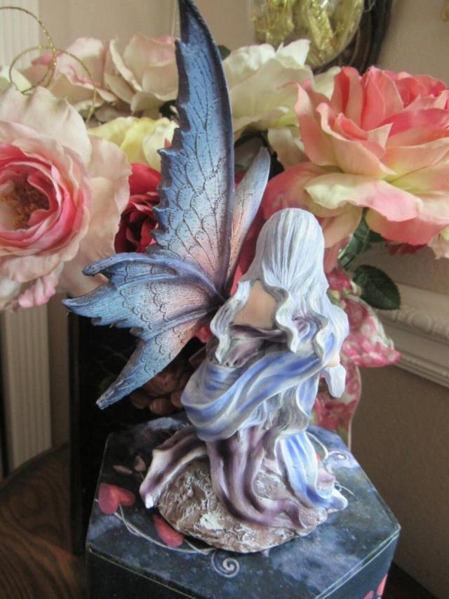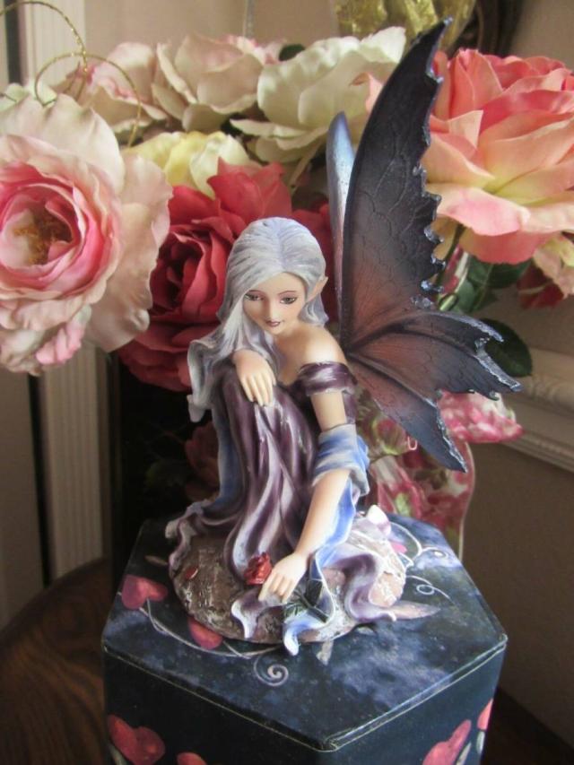 赤いバラを持った紫色の翼の妖精(フェアリー)彫像