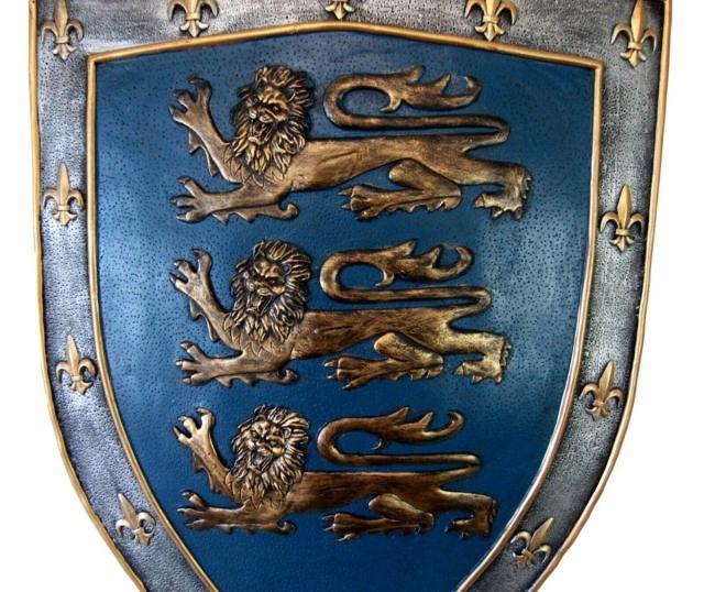 大きな中世、イングランド王室の紋章「三匹の獅子」が付いた、楯(シールド)壁掛け盾彫像