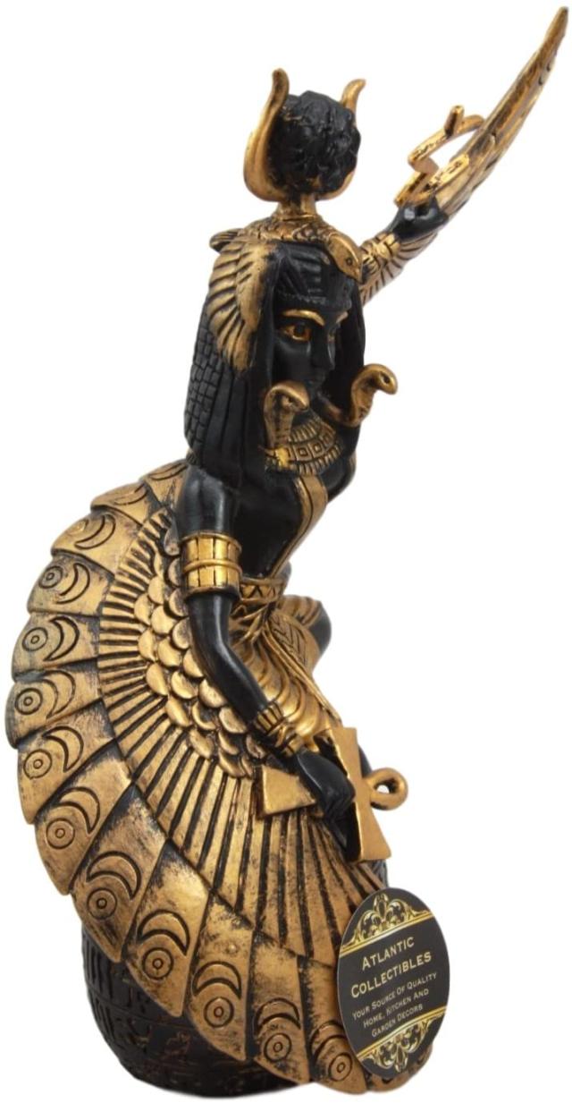 このエキゾチックな彫刻は高さ 約9.5インチで、幅 約7.5インチ 奥行 約4インチ。これはデザイナーのコンポジットレジンでできており、手塗りと研磨が施されています。エジプトの女神イシスは、非常に早い時期からさえ、エジプト全土で崇拝されていました。イシスは、女性、母親、子供たちの守護聖人と見なされていました。 さらに、古代エジプト人は彼女を魔法の女神イシスと呼んでいました。