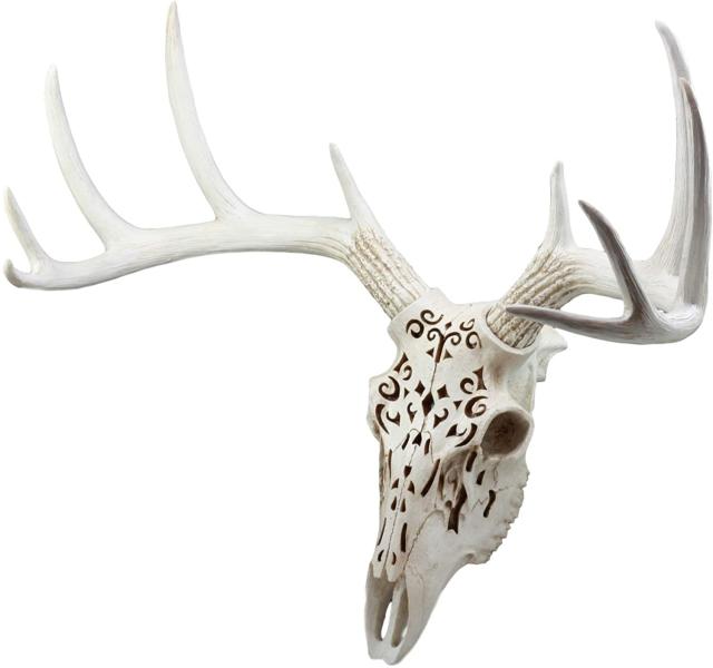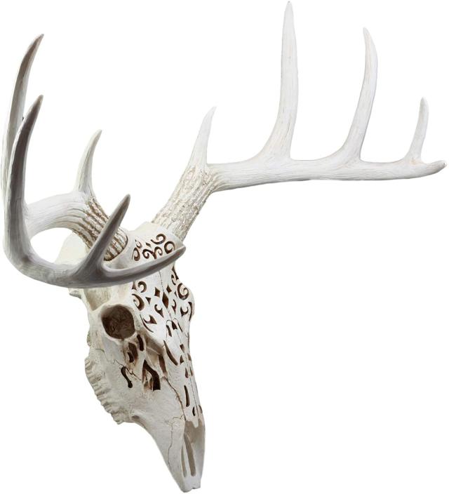 鹿の頭蓋骨を誇らしげに壁に掛けるなら、贅沢で素敵なものにしてみませんか?トロフィーの角を持つこの大きなバックスカルは、アウトドアをモチーフにしたもので、ドラマチックな細線細工のスカルヘッドでエレガントになり、アールデコの魅力が他とは一線を画しています。