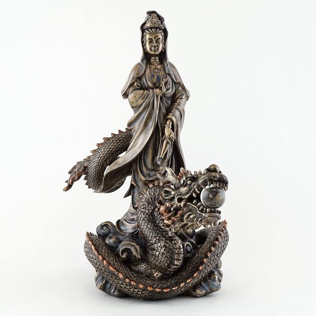 【Top Collection 13" H 10.5" L Guan Yin Riding Dragon Statue.Bronze Powder Mixed with Resin - Bronze Antique Finish. East Asian Goddessof Compassion and Mercy】
