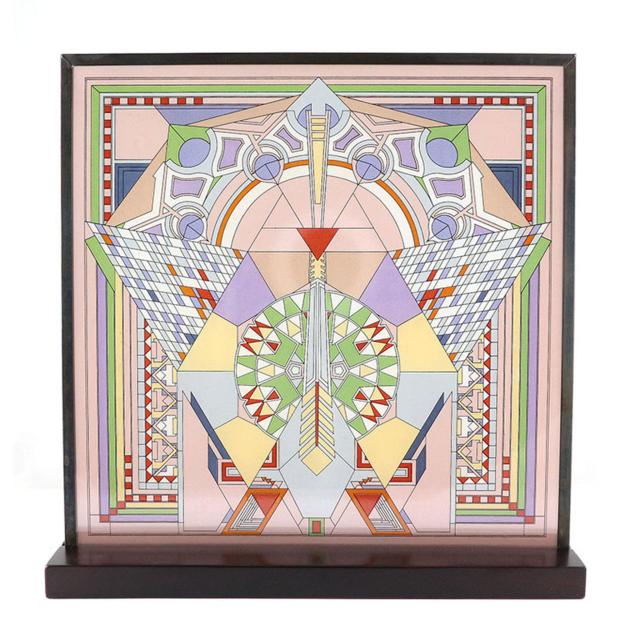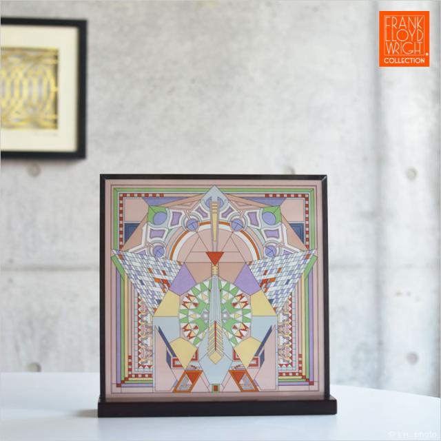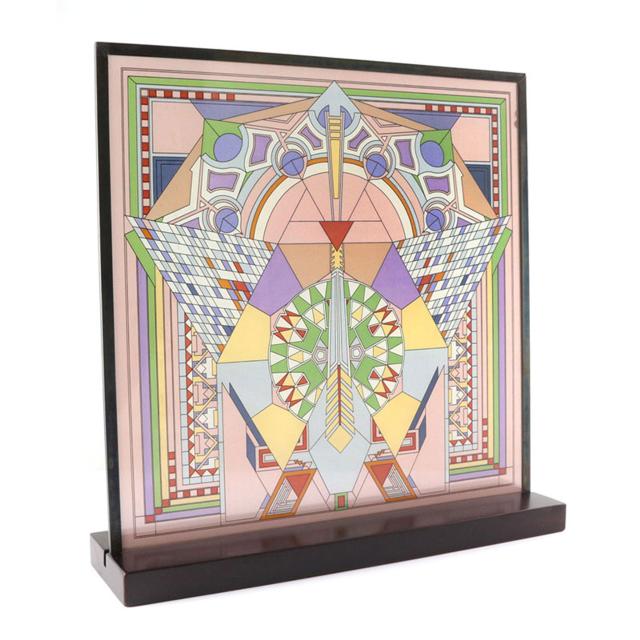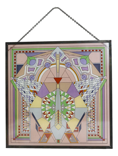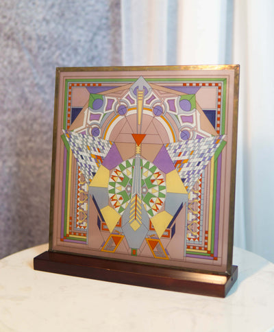 このフランク ロイド ライトの帝国ホテル ピーコック ラグ ステンド グラスは、ライトが東京の帝国ホテル(1913 年から 1922 年、1968 年に取り壊し) のためにデザインした孔雀モチーフのラグを基にしており、モチーフである孔雀の幾何学的な解釈が描かれています。ホテルの豪華なメインロビーである「ピーコックアレイ」の壁画として繰り返し描かれています。このガラスパネルでは、エナメル色が 1枚のガラスに個別に塗布され、その後窯で焼成されてエナメルがガラスに永久的に融合されています。ガラスパネルは金属製のフレームで枠付けされ、オプションのデスクまたはテーブルディスプレイ用の吊り下げチェーンと木製スタンドが含まれています。 高さ:25.4cm幅:25.4cmです。 このフランク・ロイド・ライトのガラスパネルは、 フランク・ロイド・ライト財団から正式にライセンスを取得したものです。