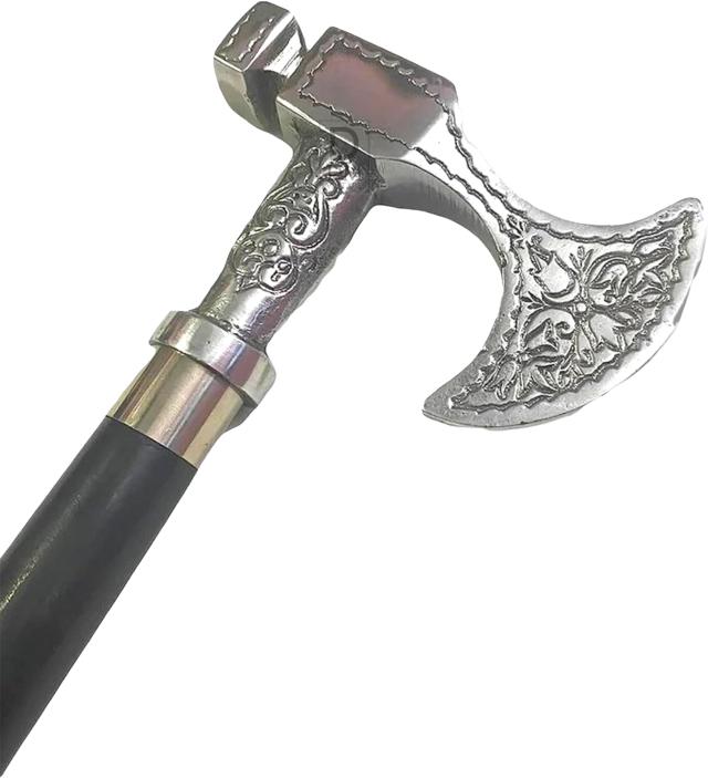 ビクトリア朝のシルバー真鍮製 斧ヘッド ハンドル付き 手作りの木製黒無地ウォーキング スティック ヴィンテージ スティッキ 杖 輸入品