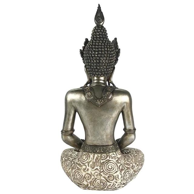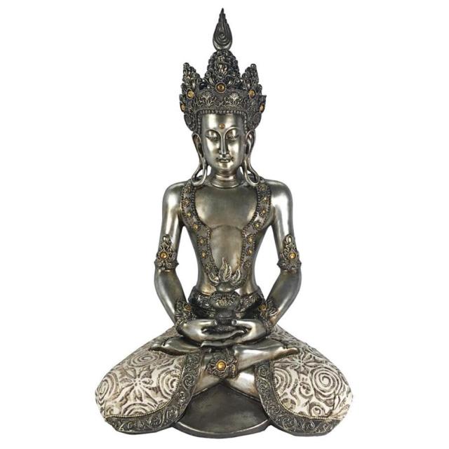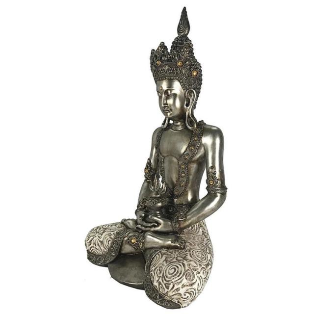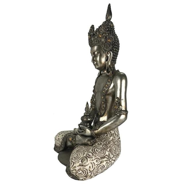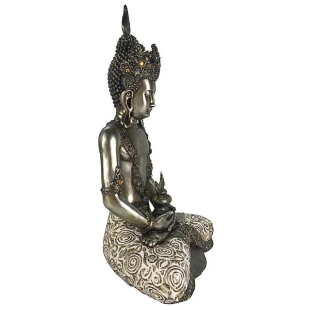 インドにて、 5世紀に悟りを開いた存在で、すべての仏陀の慈悲を体現していると言われる聖観音菩薩を鑑賞するのに、仏教徒である必要はありません。手を握り締めた禅定印のポーズで座り、流れるドーティ腰布、大きなペンダントイヤリング、頭の上に冠をかぶったこの現代的なデザインは、高品質のデザイナーレジンで鋳造されています。フェイクアンティーク風シルバーで仕上げられた、瞑想的な仏像は、フェイク宝石ストーンで輝き、本物の生地でアクセントが付けられており、あらゆる室内で、平和のイメージとして存在します。