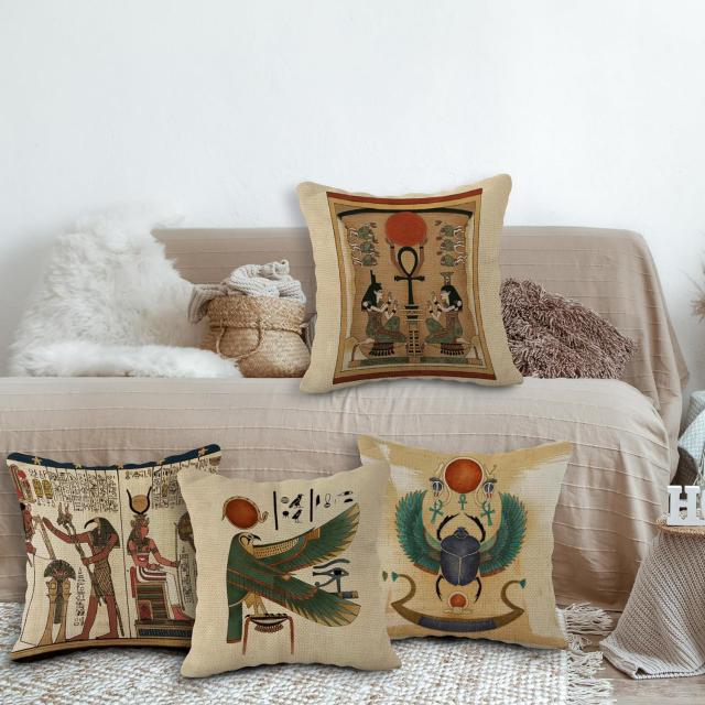 古代エジプト柄クッションカバーホルス/ファルコン/太陽神ラーリネンスローピローケース45.7cm4枚セットソファベッド輸入品