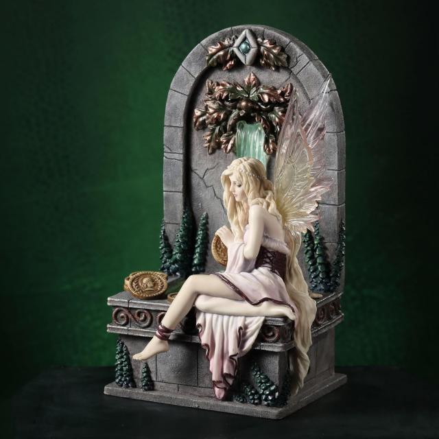 セリーナ・フェネシュによる「妖精の願いの井戸」LEDライトアップ噴水彫刻には、噴水に座ってコインを数えている妖精が描かれています。