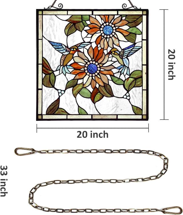 製品サイズ: ステンドグラスの窓掛けは幅 49.8cm、高さ 52.3cm、重量: 4.5kg、長さ83.8cmのチェーン付き