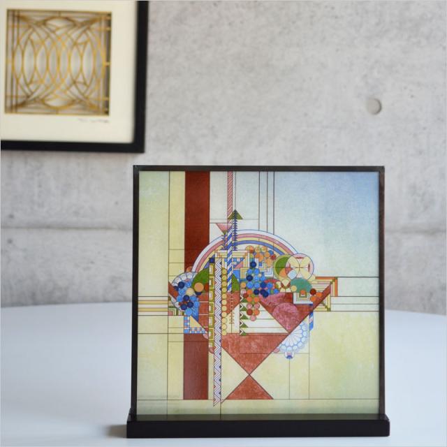 このグラフィック デザイン「メイ バスケット」は、1927年にフランク ロイド ライトによってリバティ誌のためにデザインされた 12冊の雑誌表紙のうちの 1つです。 当時は公開されていませんでしたが、これらのデザインは時代を超えたものであることが証明されています。 ライト氏は 1955年にそのうちの2つをラグのデザインに開発し、それらと他のものは、他の製品にも採用されました。このガラス パネルでは、エナメル色が 1枚のガラスに個別に塗布され、その後窯で焼成されてエナメルがガラスに永久的に融合されています。 ガラスは金属フレームに取り付けられ、吊り下げ用のチェーンと木製のベースが付属します。 この芸術的傑作は、デスクトップの飾りとして、または壁掛けのアクセント装飾として使用できます。