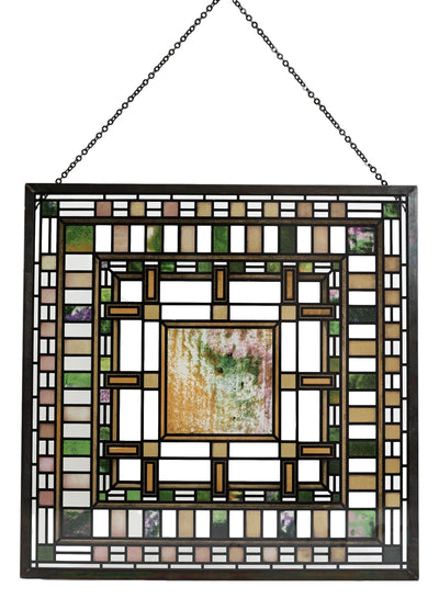 このフランクロイドライト マーティンハウス ピア クラスター レイライトガラスパネルは、ダーウィン D.マーティン ハウス (ニューヨーク州バッファロー、1903 〜 1905 年) のライトのデザインにインスピレーションを受けています。 この家のモジュール式フロアプランは、この作品の長方形の幾何学形状に反映されています。このガラスパネルでは、エナメル色が 1枚のガラスに個別に塗布され、その後窯で焼成されてエナメルがガラスに永久的に融合されています。 その後、ガラスは金属フレームに取り付けられ、吊り下げ用のチェーンと木製のプレートベースの両方が付属します。