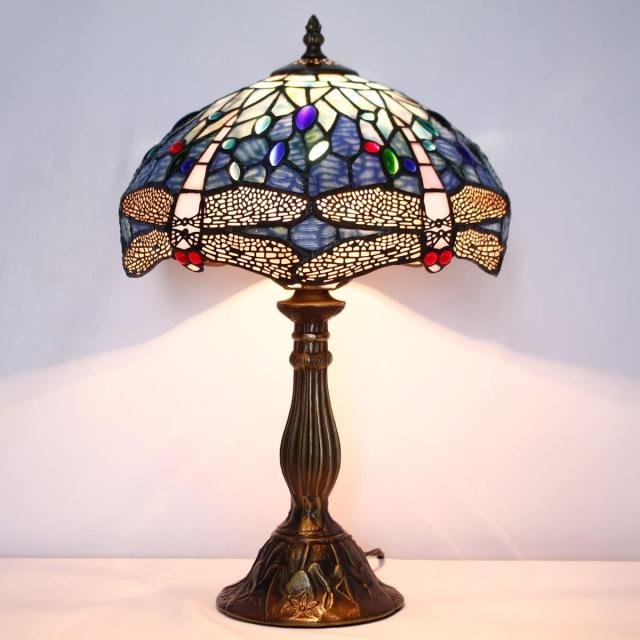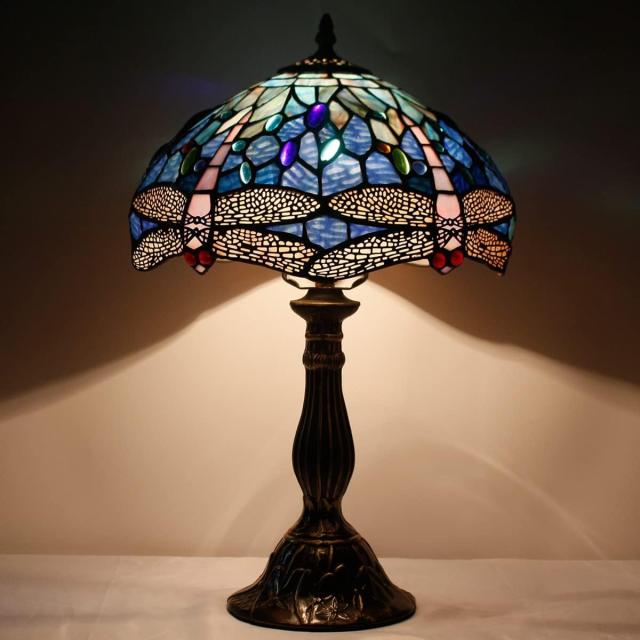 WERFACTORY Tiffany Table Lamp Blue Stained Glass Dragonfly Style Desk Bedside Reading Light 12X12X18 Inches Decor Bedroom Living Room Home Office S631 Series