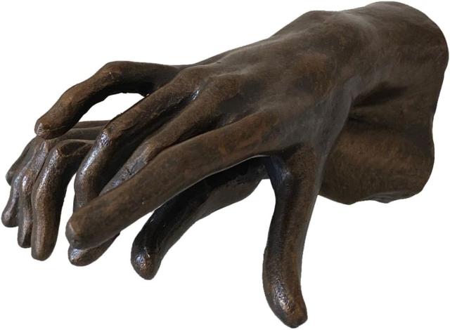 このロダンの小型レプリカ彫像は、男性の手が女性の手の上に伸びている様子を表現しています。
