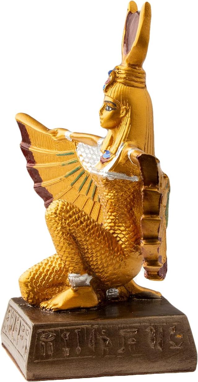 この翼のあるイシス像はポリマーで鋳造されており、ペイントのアクセントが付いたゴールド仕上げになっています。