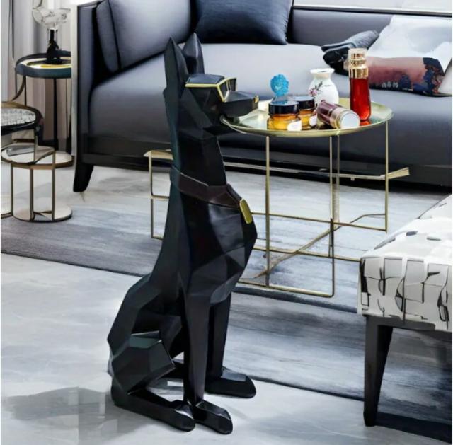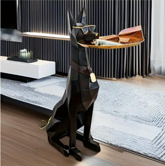 ゴールド色のトレイを咥えた、ドーベルマン犬 小物テーブル彫像 オーナメント置物装飾ホームデコ プレゼント 贈り物輸入品