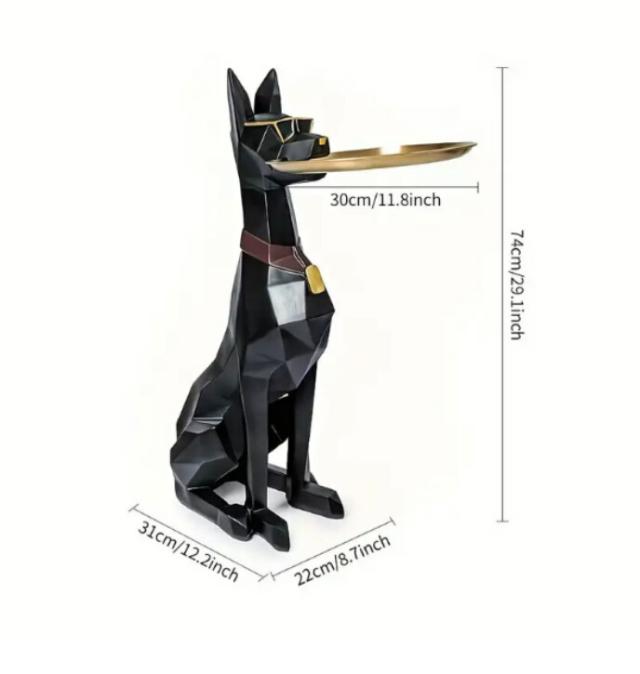 Doberman dog holding a gold tray in its mouth. Small table statue, ornament, figurine, decoration. Home decor, present, imported item.