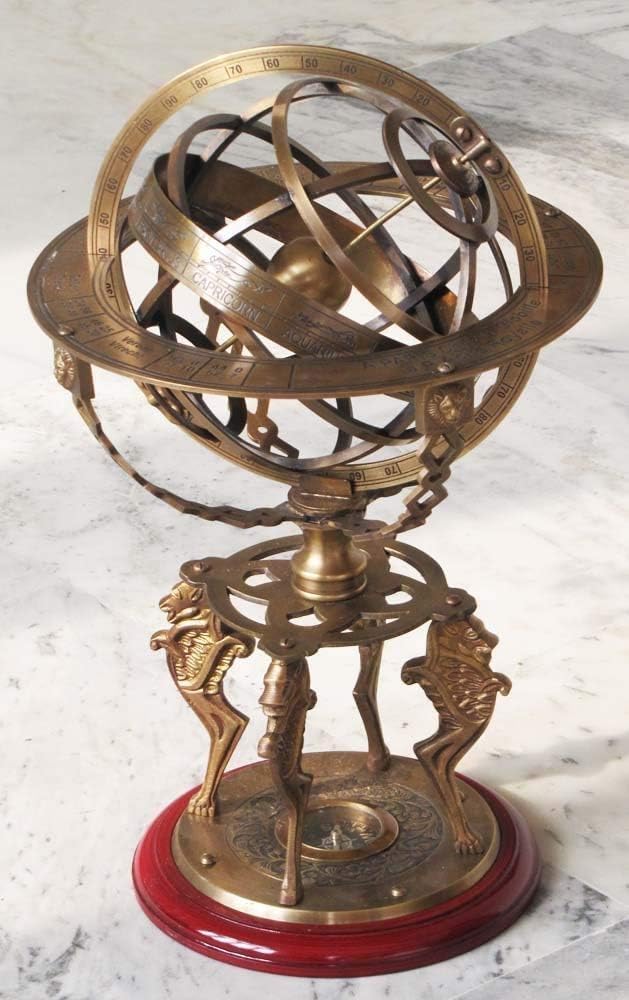 Antique Brass 18" Armillary Sphere Globe Astrolabe Zodiac Engraved Celestial Globe Wooden Base with Compass & Tiger Pillars