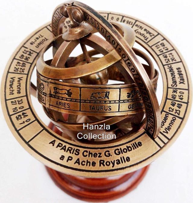 アンティーク風 真鍮製 45cmアミラリー球体 アストロラーベ ゾディアック星座が彫刻された天球儀 コンパスとトラの柱が付いた地球儀 木製ベース 輸入品
