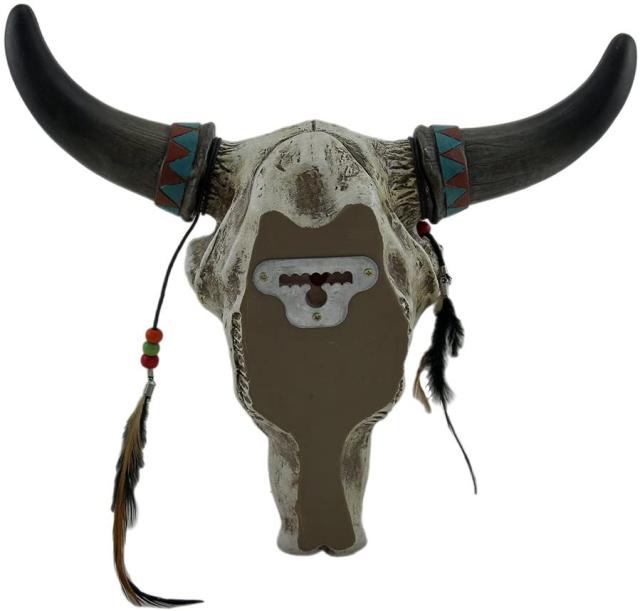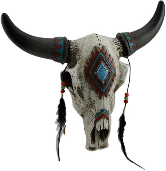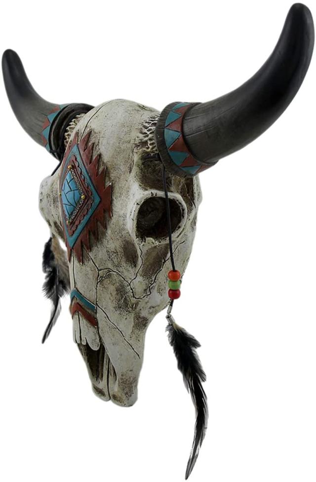 【ビーズ付きフェザーと、フェイク・ターコイズ・ストーンを付けた素朴なサウスウエスト・ブルスカル 牡牛頭骸骨彫像 壁彫刻 贈り物(輸入品)】