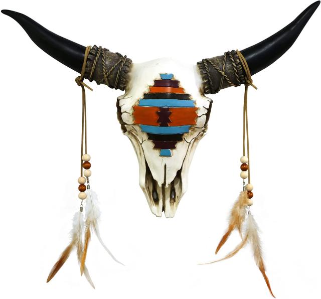 羽の装飾が施された、南西部のロングホーン・バイソン・雄牛の頭蓋骨の壁装飾-彫刻