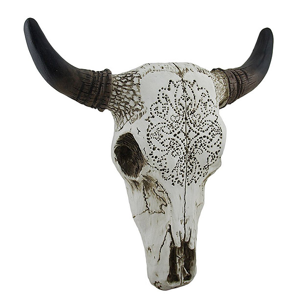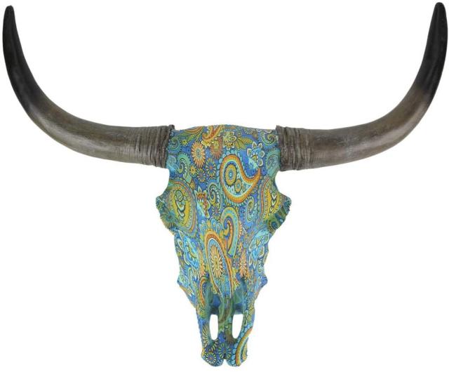 【茶色の羽の装飾が施された、南西部のロングホーン・バイソン・雄牛の頭蓋骨の壁装飾-彫刻、リビングルーム彫像(輸入品)】
