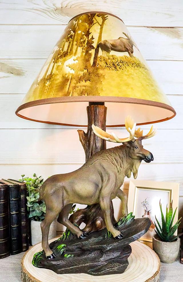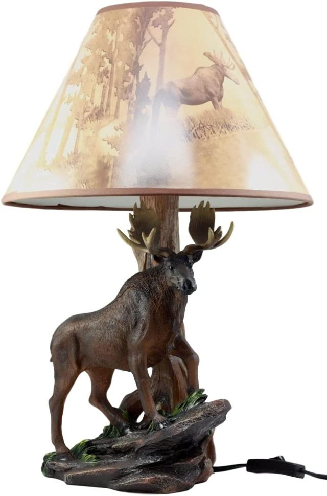 北アメリカ 大自然のヘラジカ彫刻台座、デスクトップ・テーブルランプ彫像 プリントシェード(輸入品