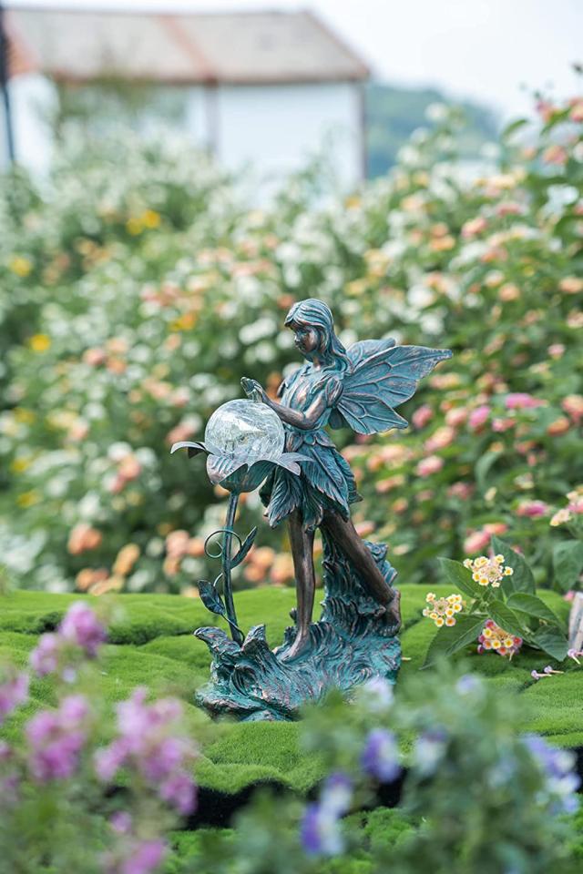 庭の天使にインスパイアされたエレガントな立ち姿の庭の妖精がガラスの球体に触れ、庭全体に愛と暖かさをもたらします。