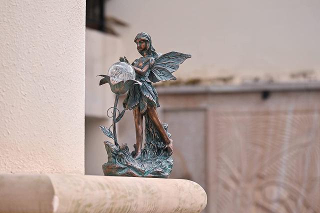 【TERESA'S COLLECTIONS Large Garden Fairy Outdoor Statue, Solar GardenSculptures & Statues with Crackle Glass Globe, Bronze Patina GardenArt for Lawn Patio Yard Decor 13.2 inch】