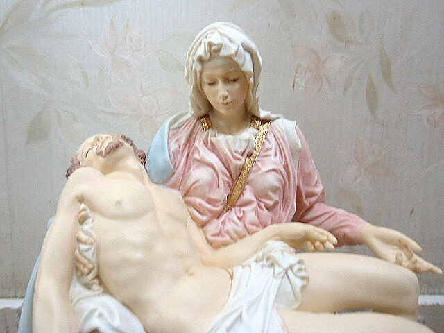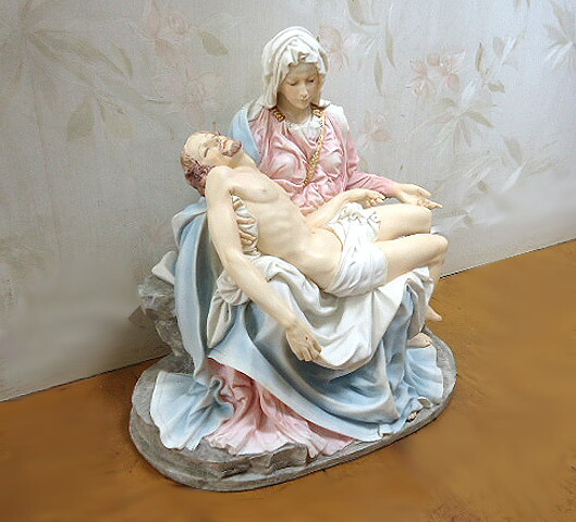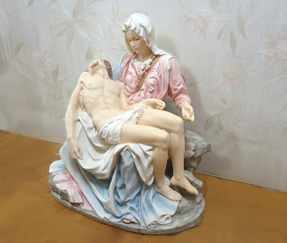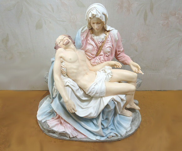 この崇高な高さ約27cmのミケランジェロ作のピエタ彫像装飾置物は、薄いピンクとブルーで彩色されており、どこにもない最高のディテールと最高品質を備えています。
