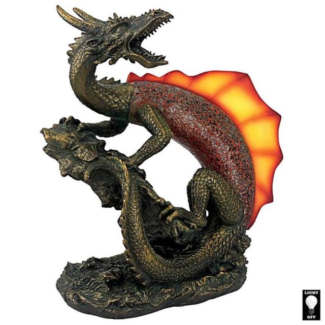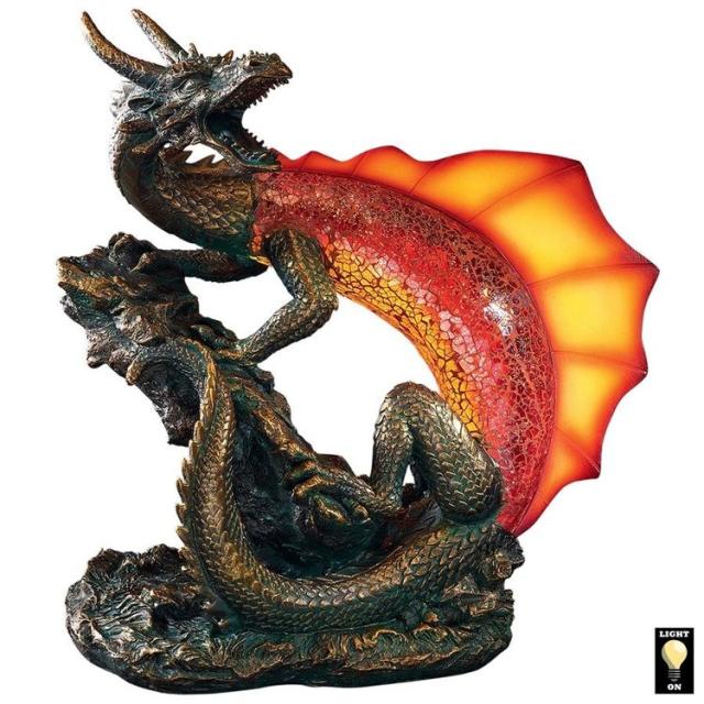 これを見たすべてのドラゴンコレクターは、燃えるような赤に輝くモザイクガラスのピースと、このデザイントスカーノを真に傑出したピースにする照らされた胴体の両方に興奮しています! 家やギャラリーでゴシックの目玉として劇的なシズルをもたらす火を吐くドラゴンの蛇で夜を照らしてください。 アンティークの真ちゅう仕上げの高品質なデザイナー樹脂で鋳造された、オープンジョーとパワフルなテールを備えたコレクター向けのドラゴンランプは、照明のない彫刻のように美しいですが、LEDがコードのスイッチで照らされると二重に劇的になります。 中世の傑作と素晴らしい贈り物!