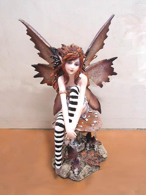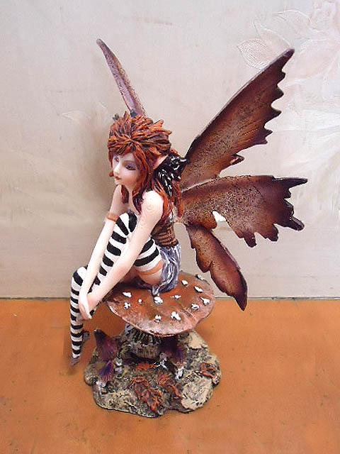 茸の上に座っている、いたずら好きな茶色の妖精 フェアリー彫像 彫刻 エイミー・ブラウン作(輸入品