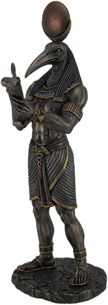トート神は古代エジプトの書記、魔法、知恵、そして月の神であり、セトの額からホルスの種から自己創造または生まれたと言われています。これらの2つの神は秩序と混沌を表し、トートをバランスの神としました。 彼はしばしばトキの頭で描かれ、頭の上に月の円盤をかぶっています。彼は公正な裁判官であり、腐敗しない役人としての神聖な模範者でした。 彼の相手はセシャトでした。この素晴らしいアート作品では、文字の発明者としてパピルスに文字を書いているトート神が芸術的に捉えられています。コールド キャスト製で ブロンズ風に再現彫刻されており、ブロンズパウダーと樹脂を混合して金属の外観を作り出し、色分けされ、トート神に命を吹き込みます。エジプト神話愛好家やエジプト史愛好家を喜ばせるギフトとして最適です。
