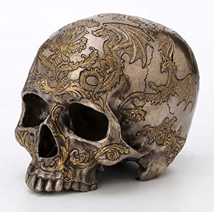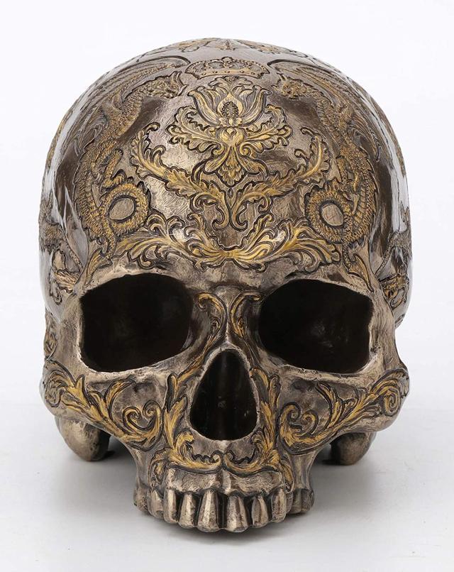 このひどく素晴らしい人間の頭蓋骨の彫像は、勇気と強さを象徴する紋章の空飛ぶドラゴンの紋章スタイルのシンボルで覆われています。ブロンズパウダーと樹脂を混合するプロセスであるコールドキャストブロンズで複雑に彫刻された仕上げは、本物の金属の外観を持ち、色のタッチで手作業で詳細に描かれています。この図は、高さ5インチ、奥行き8.75インチ、幅4.5インチです。 それは完璧なハロウィーンの装飾になり、頭蓋骨愛好家への素晴らしい贈り物です。