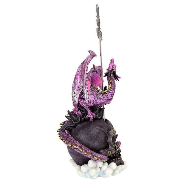 中世のサベージ セイバー 切れ味の良い剣で、疑わしい荷物や毒ペンの手紙に斬り込みましょう! 頭蓋骨の上に、信じられないほど細かく彫刻された火を吐くドラゴンが構えた、鋳造金属製の取り外し可能な卓上剣は、まさに機能を持ったアートです。 鱗状の尾と開いた牙を持つ ゴシック様式の守護獣は、高品質のデザイナーレジンで鋳造され、燃えるような虹色の色合いで手描きされており、別世界のような存在感を示しています。