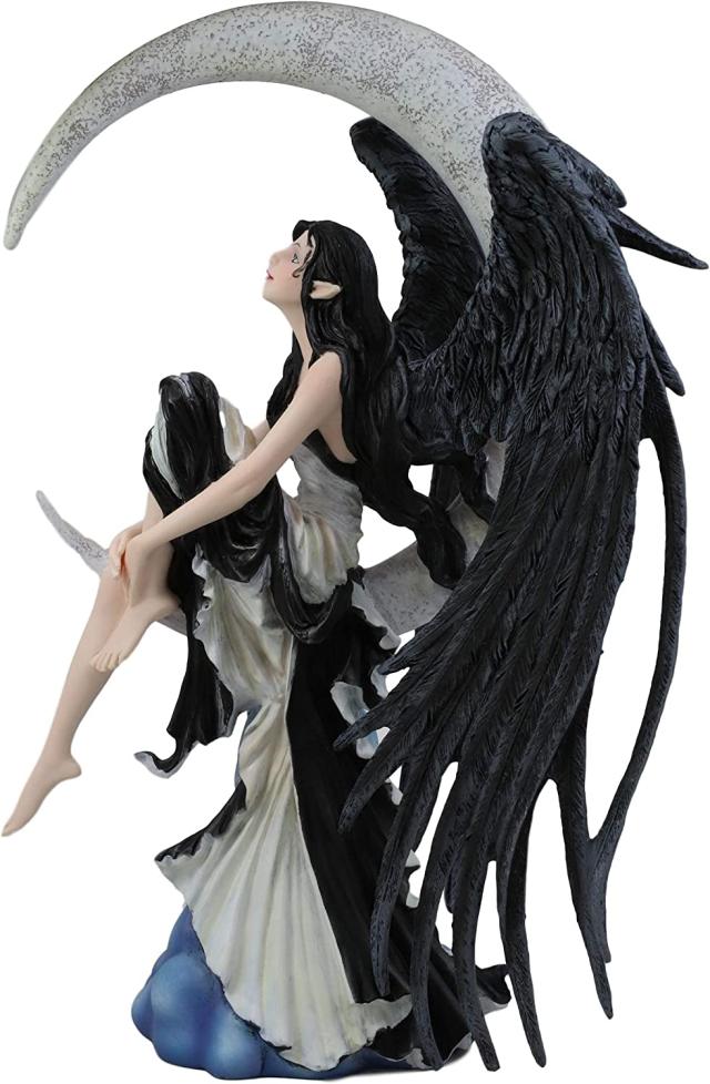 この究極に美しい彫像は、ネネ・トーマスのアートワークに基づいています! 妖精は黒い羽毛の天使の翼を持ち、三日月の上に腰掛けて、天の奥深くを見上げています。黒檀の髪とダークアイボリーのドレスを着た彼女は、魅惑的な光景です!