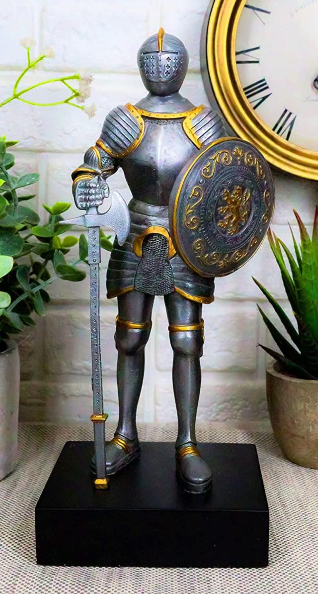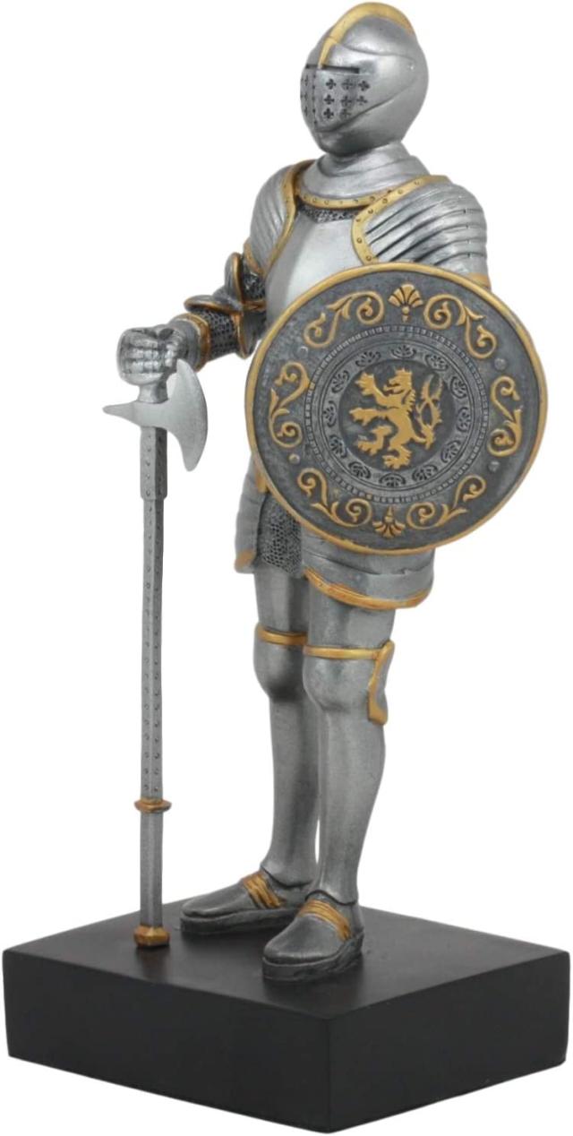 【Ebros Medieval Armory Valiant Knight with Axe and Round Shield Figurine9" Tall with Heraldic Coat of Arms Royal Lion Shield and Axe Suitof Armor Sculpture】