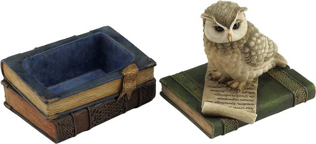 このゴージャスな 高さ 約11.4cmの襟付きのコノハズクが、本の上に乗っている、装飾用小物入れです。細部までこだわった最高の品質を備えています。