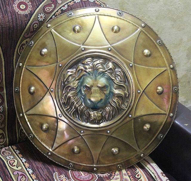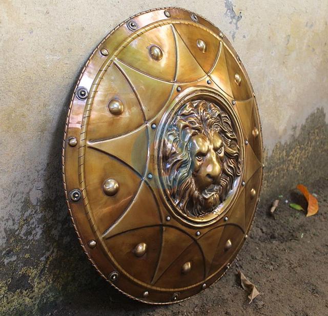 トロイの木馬で有名なトロイ戦争 ライオンの飾りを付けた古代ギリシャのシールド楯 手作り金属工芸品