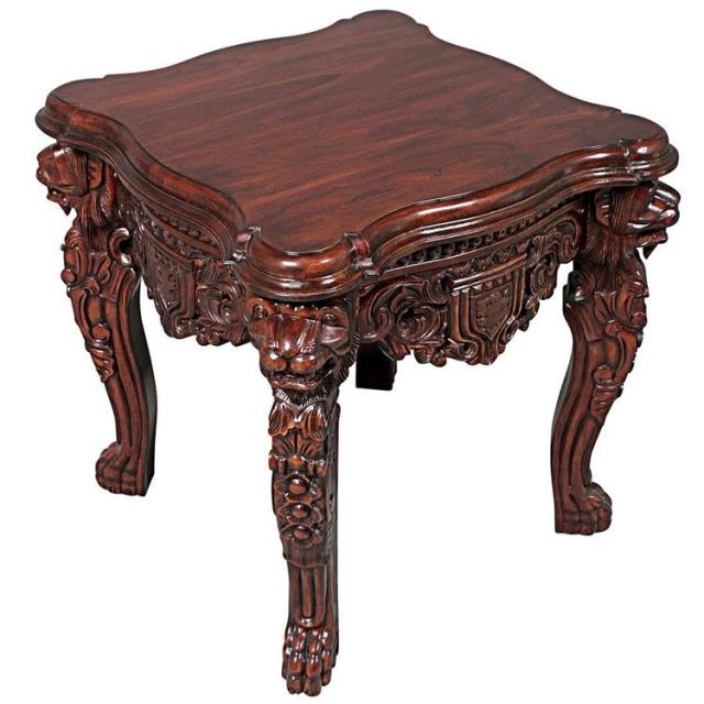 この中世アンティーク・レプリカは、歯をむき出しにし、深く彫刻されたライオンの頭と雄大なライオンの足を誇る、機能的なサイドテーブルです。
