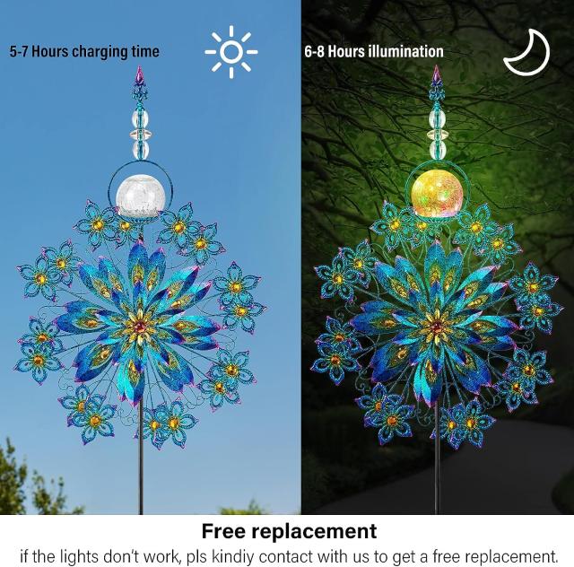 ソーラーウィンドスピナーは繊細な孔雀のディテールのブレードと花で構成されており、上部にあるLEDガラスボールは夕暮れ時に自動的に点灯します。